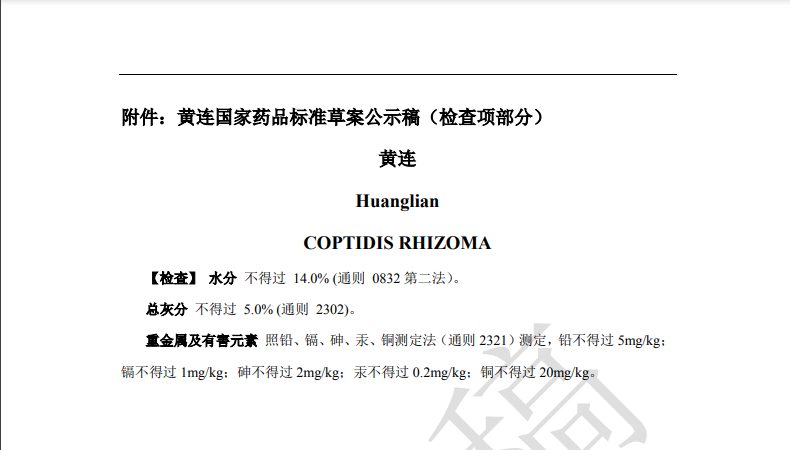 隨著《中藥法典》標(biāo)準(zhǔn)修訂進(jìn)程的推進(jìn),藥典委官網(wǎng)近期陸續(xù)發(fā)布多個(gè)標(biāo)準(zhǔn)公示,均與中藥重金屬及有害元素控制相關(guān)。其中,“關(guān)于黃連國(guó)家藥品標(biāo)準(zhǔn)草案的公示”、“關(guān)于艾葉國(guó)家藥品標(biāo)準(zhǔn)草案的公示”、“關(guān)于川芎國(guó)家藥品標(biāo)準(zhǔn)草案的公示”,對(duì)相關(guān)檢測(cè)項(xiàng)擬進(jìn)行修訂。公示期為30天。通知表示,若有異議,可及時(shí)在線反饋,并附相關(guān)說明、實(shí)驗(yàn)數(shù)據(jù)和聯(lián)系方式。