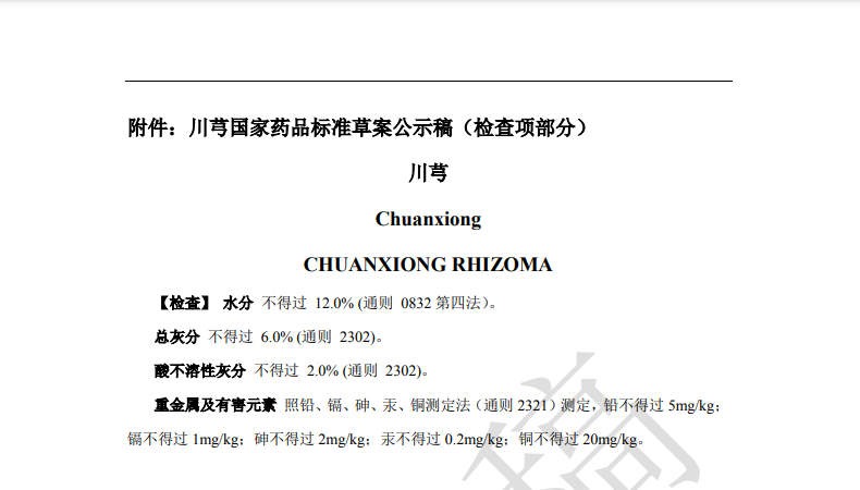 本次草案修訂,主要是根據(jù)產(chǎn)品重金屬及有害元素蓄積及與土壤相關(guān)性研究結(jié)果,擬新增重金屬與有害元素檢查項(xiàng)。均要求【重金屬及有害元素】照鉛、鎘、砷、汞、銅測(cè)定法(通則2321)測(cè)定,鉛不得過 5mg/kg;鎘不得過1mg/kg;砷不得過2mg/kg;汞不得過 0.2mg/kg;銅不得過 20mg/kg。
