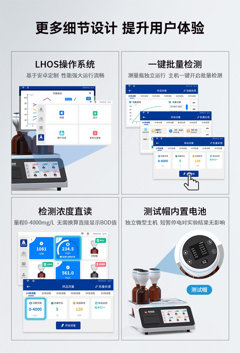 4.量程0-4000mg/L,檢測(cè)濃度直讀,無(wú)需換算直接顯示BOD值,采用安卓系統(tǒng)算法更新,硬件升級(jí)低量程測(cè)值更準(zhǔn);
