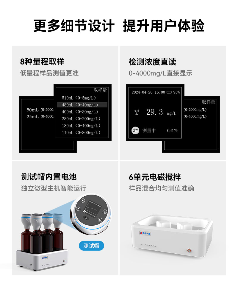 3、量程0-4000mg/L,支持8種量程取樣選擇,檢測(cè)濃度直讀,無(wú)需換算直接顯示BOD值,硬件升級(jí)低量程測(cè)值更準(zhǔn);