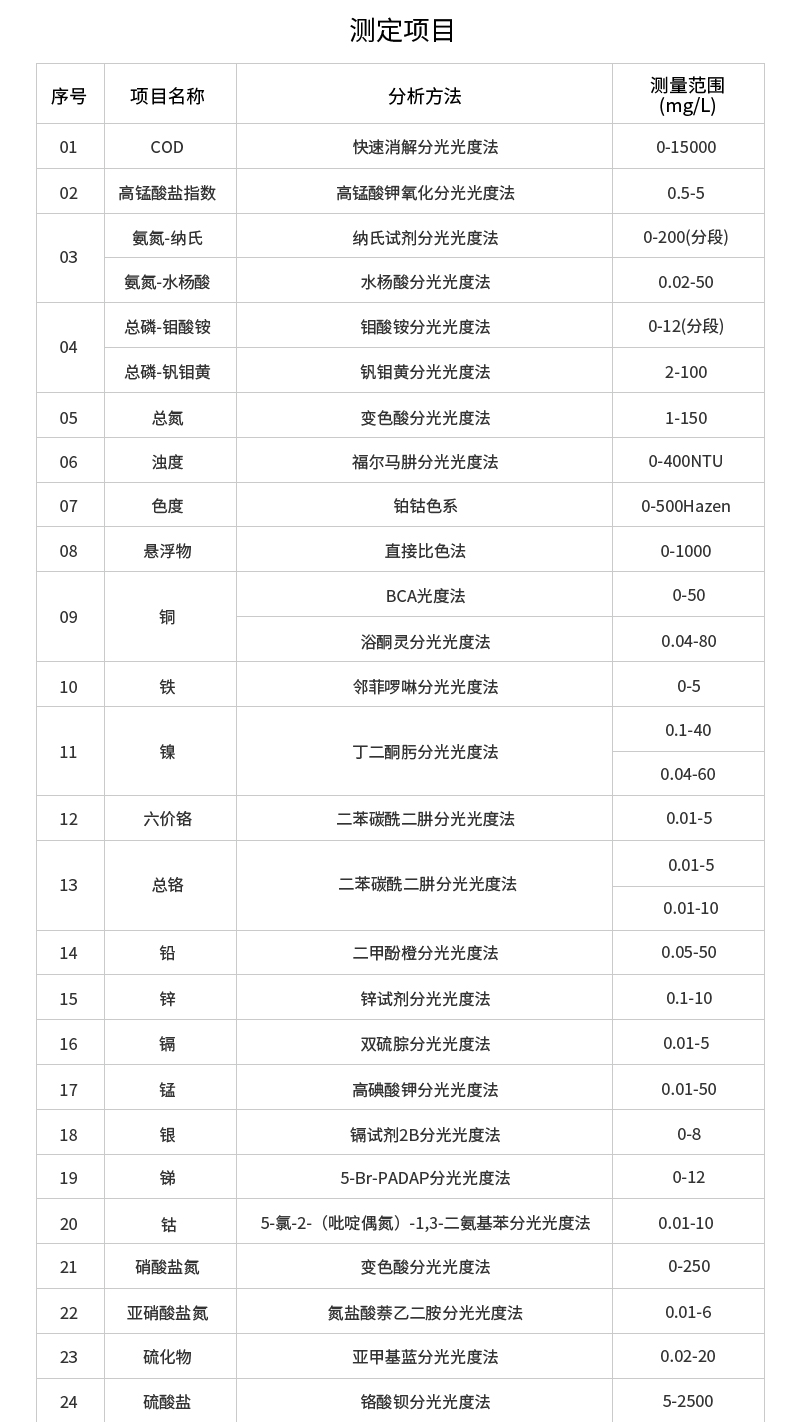 檢測(cè)限:COD高量程3mg/L;COD低量程0.5mg/L
